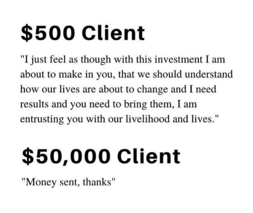 Strive to have 50-100% more prospects than you can handle. If you can handle 20 clients, have at least 30/40 on the waiting list. That way, you’ll never have the stench of desperation, it’ll be easier to act according to your fiduciary duty (more on that in a second), and you can exclusively work with clients who’re so fucking cool, you’d pay to work with them. Because of the situation I’m in, I’m able to reject prospects simply because our personalities don’t fit. If I can’t hang with you, I don’t wanna work with you. You can’t do that if you need 10 clients to survive and you’re at 3.